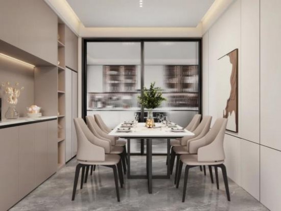 餐廚空間以長虹玻璃隔斷,通透性十足。米色入墻柜,集實用性與美觀性于一體,豐富空間功能。CBD家居·黑金 | HZ206餐桌,天然爵士白桌面提升空間質(zhì)感,方形四角圓弧處理,溫柔呵護(hù),打造舒適溫情的用餐時光。
