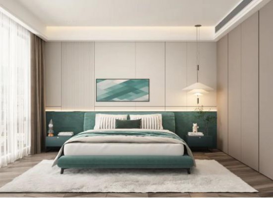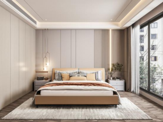 空間被淺灰咖的溫馨感包裹,大片落地窗是點(diǎn)睛之筆,引景入室,得到更適意的生活體驗。CBD家居·黑金 | HZ018軟床,橡木黃色如陽光一般,讓臥室充盈自然暖意,細(xì)節(jié)處間以藍(lán)色線條點(diǎn)綴,彰顯生活的精致感。