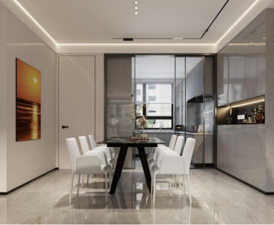 橫向考慮的話,設(shè)置落地窗能有效增強室內(nèi)采光,以及將客廳、餐廳、廚房打通成一體化空間,增強互動性,也強化了整體的空間感。另外整體空間里要避免實體隔斷,鏤空柜、玻璃都是不錯的選擇。