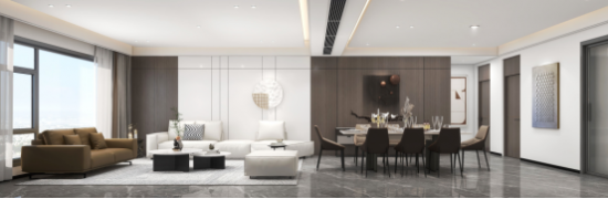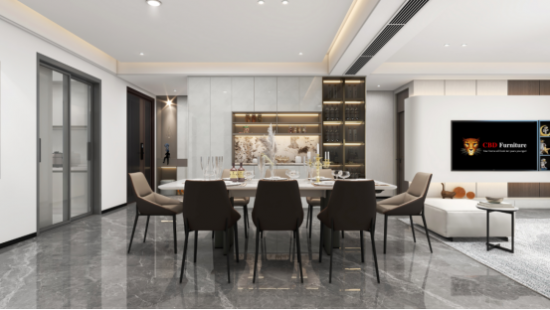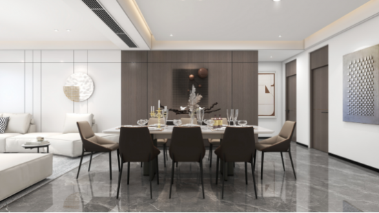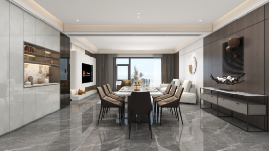 餐廳區(qū)域預(yù)留足夠的生活的動(dòng)線,灰色大理石地板通透高級,自然的紋理時(shí)尚簡約,營造出頗具格調(diào)的用餐氛圍。