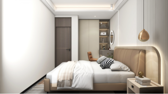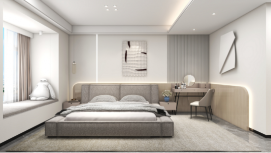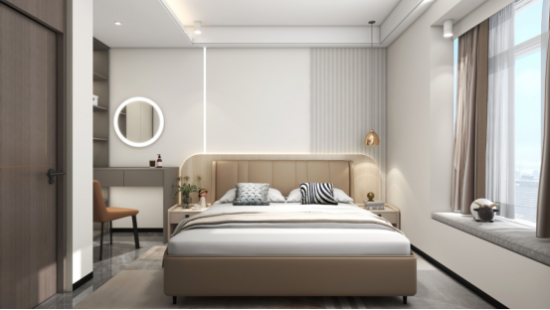 基于實(shí)際需求規(guī)劃格局,簡潔色調(diào)的空間幾乎“一應(yīng)俱全”,飄窗、梳妝臺(tái)、儲(chǔ)物柜,打造出專屬的生活空間。CBD家居·DUKE | DK021軟床,咖色舒緩優(yōu)雅,搭配不規(guī)則線條設(shè)計(jì)的靠包,彰顯隨性的現(xiàn)代格調(diào)。