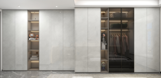 定制墻柜一柜到頂,淺灰與臥室色調(diào)和諧統(tǒng)一。內(nèi)分柜收納有序,更具靈活性;內(nèi)嵌燈帶裝飾點(diǎn)綴,時(shí)尚美觀。